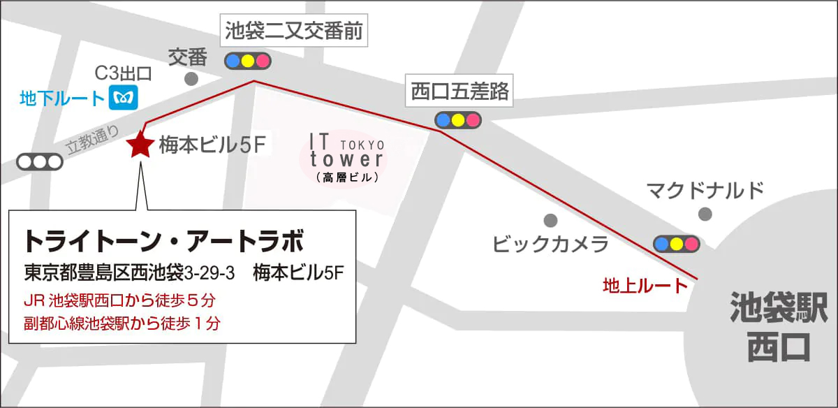 まもなく信号と交番があります。「池袋二股交番前」です。その信号を斜め左方向に20mほど進むと(交番側に信号は渡りません)、左側にレンガのビルが見えます。「梅本ビル」です。中に入り、エレベーターで5階まで上がってください。